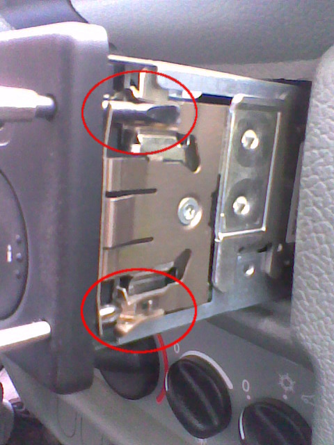 En la segunda imagen se ven las pestañas que retienen la radio, y cómo al introducir el destornillador se mueven hacia la radio, desbloqueando su salida.