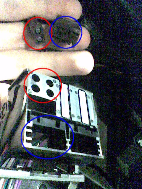 Hay que meter el filo de la navaja y de las tijeras por los huecos rectangulares, con la punta por la parte exterior, y una vez dentro empujar hacia el interior. Con eso meteremos la pestaña que sujeta la radio. En la imagen se ve la forma de la tijera (roja), hacia dónde hay que empujar, qué hay que empujar (azul) y la pestaña (verde) que retiene la radio.