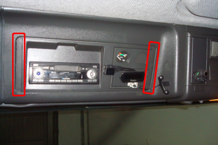 No tengo fotos iniciales, pero en la imagen se ven las tapas que quitándolas haciendo presión, se verán los tornillos que sujetan todo el módulo de la radio y los indicadores de la derecha.